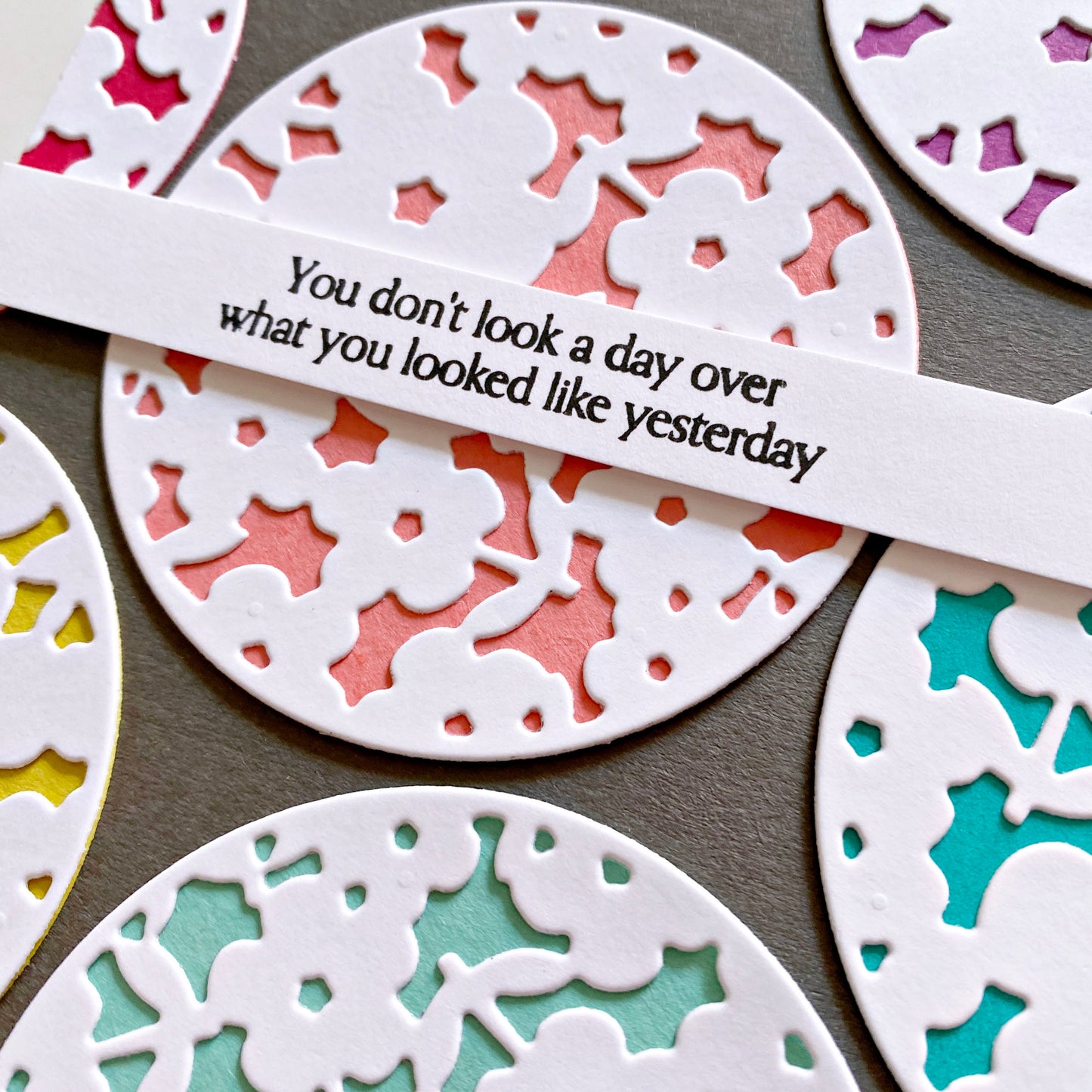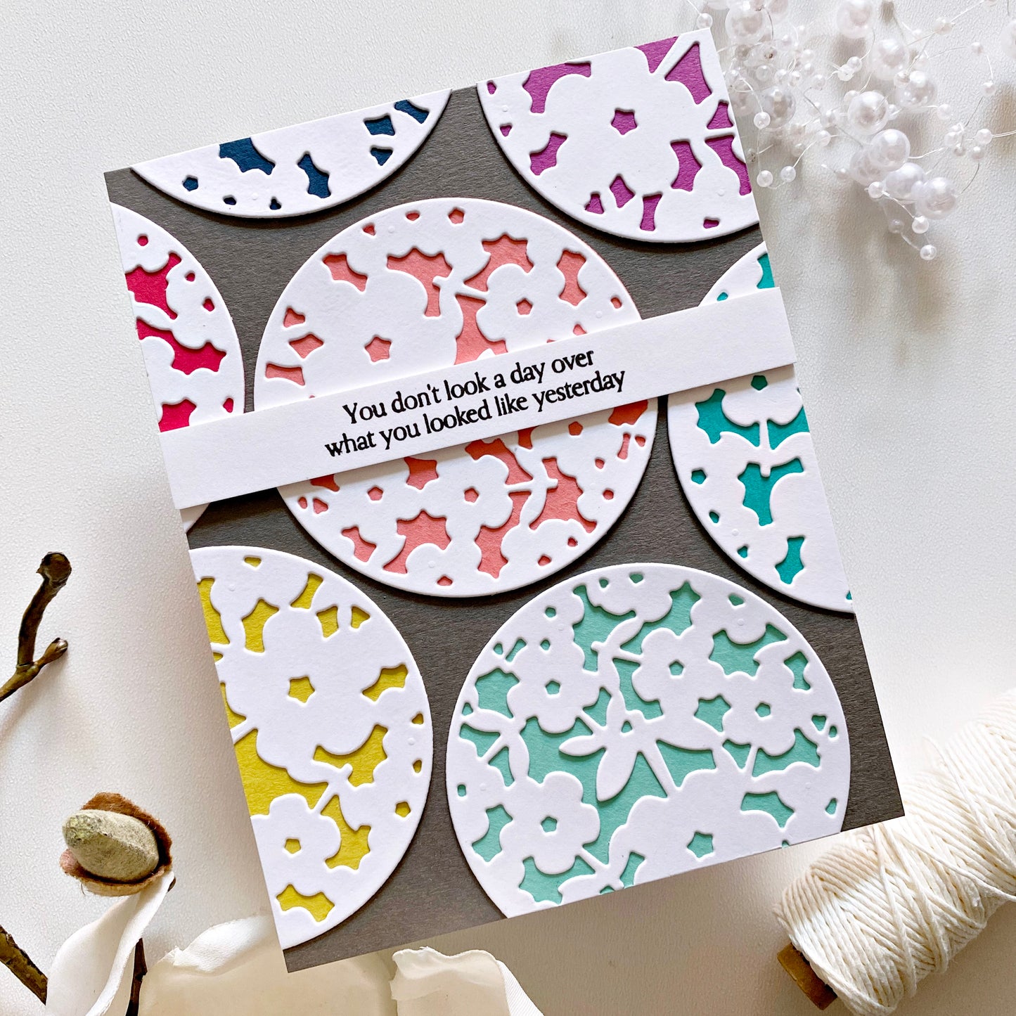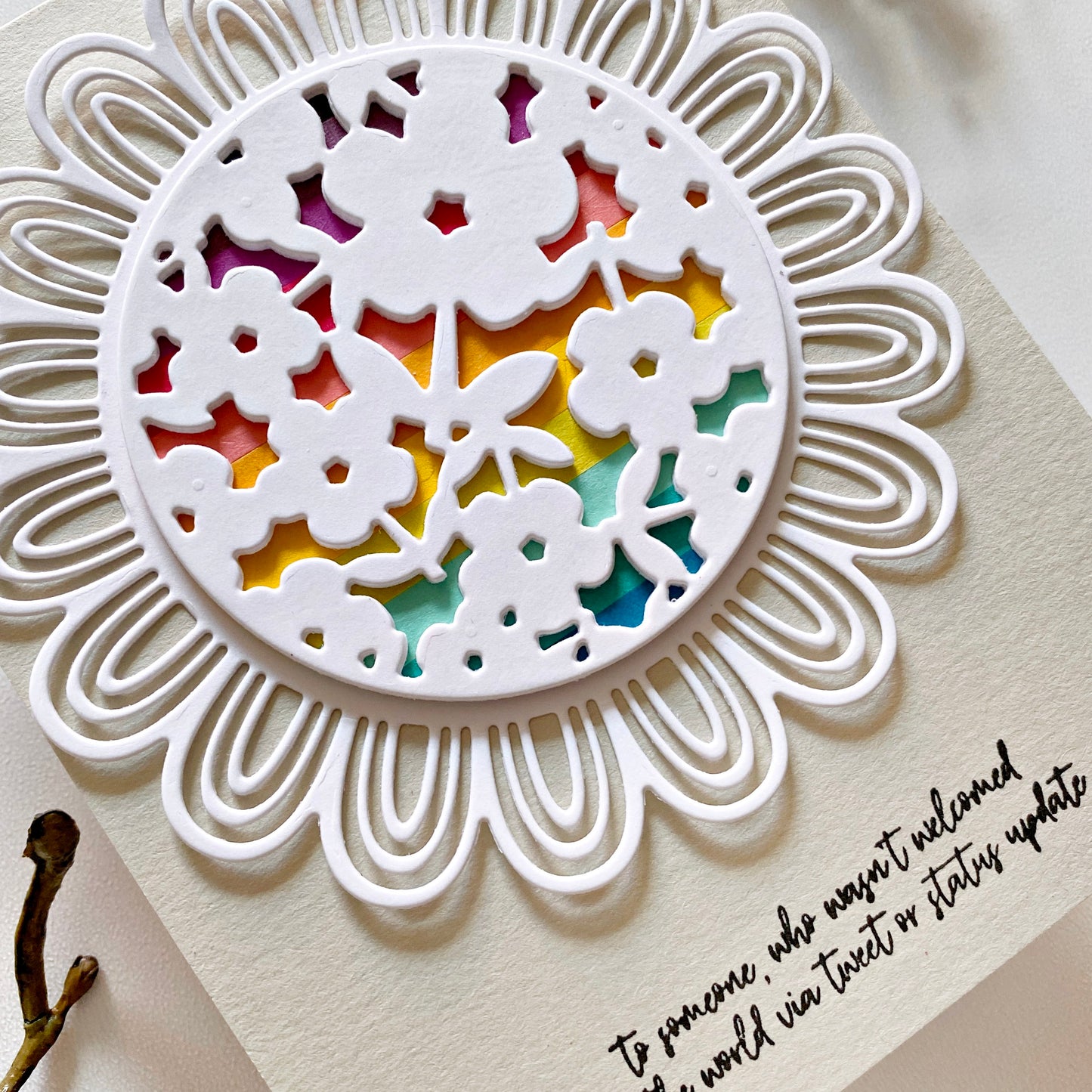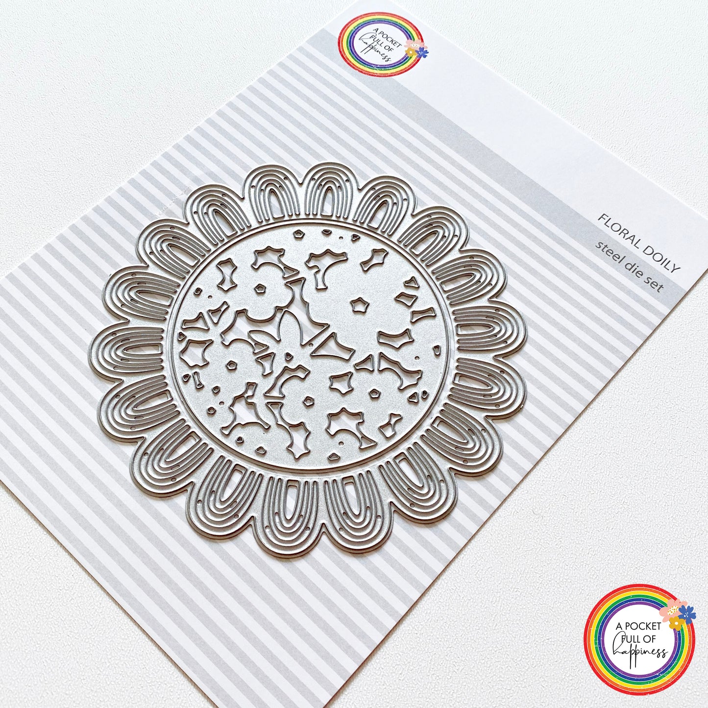 Ein Set mit 2 Stanzen. Das Doily ist etwa 4,25 x 4,25" / 10,8 x 10,8 cm groß, der Blumenkreis ist etwa 2,68 x 2,68" / 6,8 x 6,8 cm groß. Lasst euch von den Kartenbeispielen inspirieren. Wir haben auch ein Prozessvideo mit diesem Stanzenset auf unserem YouTube-Kanal!